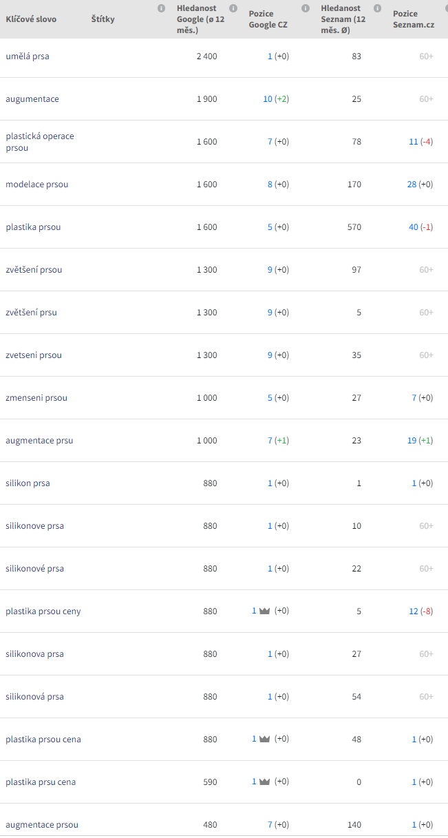 Provedli jsme také analýzu klíčových slov na webu klienta ve srovnání s klíčovými slovy na webu konkurentů. Objevili jsme řadu slov a frází, které na klientově webu chyběly a přitom pro něj měly nemalý potenciál.